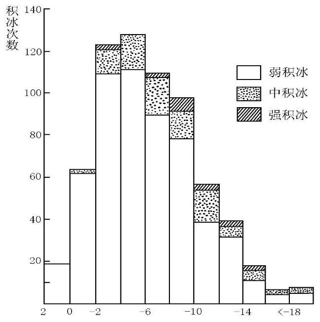 积冰一般发生在云中温度露点差<7℃范围内,以0~5℃发生积冰最多;强积冰多发生在温度露点差为0~4℃范围内。