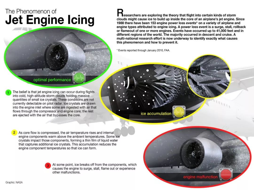 降低动力装置效率,甚至产生故障:在飞机其他部位没有结冰时,喷气式发动机进气道有时会有积冰。因为机翼和尾翼前部的动力增温,比喷气式发动机进气口处要大得多,飞行实践证明,当外界气温等于小于+5°C时,喷气式发动机进气口部分可以发生结冰。