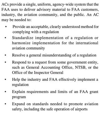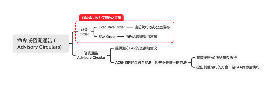 (Order)和咨询通告(Advisory Circular, ACs)。An AC is an informational document that the FAA wants to distribute to the aviation community. … They are to be used for information only and are not regulations.
