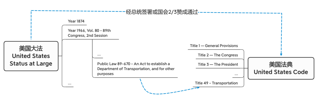 国会所通过的法案都会以编年的形式收录成册(就是把一年里通过的法案做成一个小本本),以《美国大法》(后文简称“大法”)(Status at Large)的书名出版(由政府印刷出版社出版,Government Printing